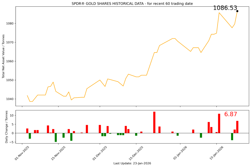 截至2026年1月23日,全球最大的黄金ETF SPDR Gold Trust持仓量为1086.53吨,较上一个交易日增加6.87吨。2026年1月23日现货黄金自4935.96美元/盎司开盘后延续前日涨势,在4960附近受阻,盘中最低向下触及4899.9美元/盎司,随后震荡上行至4989.943美元/盎司,再创历史新高。最终收于4988.17美元/盎司,涨50.03美元或1.01%。