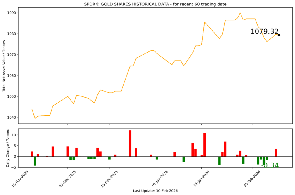 截至2026年2月10日,全球最大的黄金ETF SPDR Gold Trust持仓量为1079.32吨,较上一个交易日减少0.34吨。2026年2月10日现货黄金自5067.09美元/盎司开盘后暴跌八十美金至当日低点4987.67美元/盎司,随后迅速拉回。亚盘和欧盘时间在5013-5056美元/盎司宽幅震荡,美盘交易时间盘中最高向上触及5078.67美元/盎司,后快速回落至5000美元关口低位震荡。最终收于5023.88美元/盎司,跌34.93美元或0.69%。